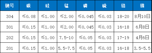 不锈钢在冶炼过程当中,由于加入合金元素品种不同,不同品种加入量的不同。其特性也是不同的,为了加以区别则冠上了不同的钢号,下面是常见装饰用不锈钢不同钢号“合金元素”含量表仅供参考: