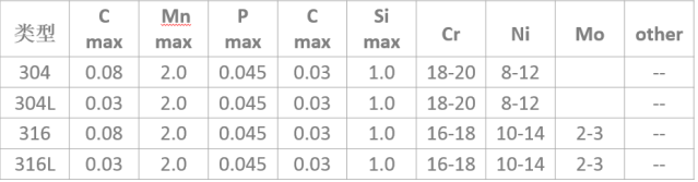 不锈钢:耐空气、蒸汽、水等弱腐蚀介质或具有不锈性的钢种。通常使用的钢种为304、304L、316、 316L,是奥氏体不锈钢的300系列钢。